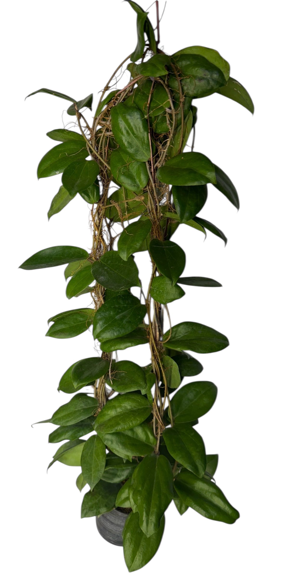 The plant has small, thick, waxy leaves with prominent veins and a satin texture. New growth often displays a vibrant yellow-green hue that can deepen to a darker green as it matures, and may develop a reddish tinge when "sun stressed" with bright light.